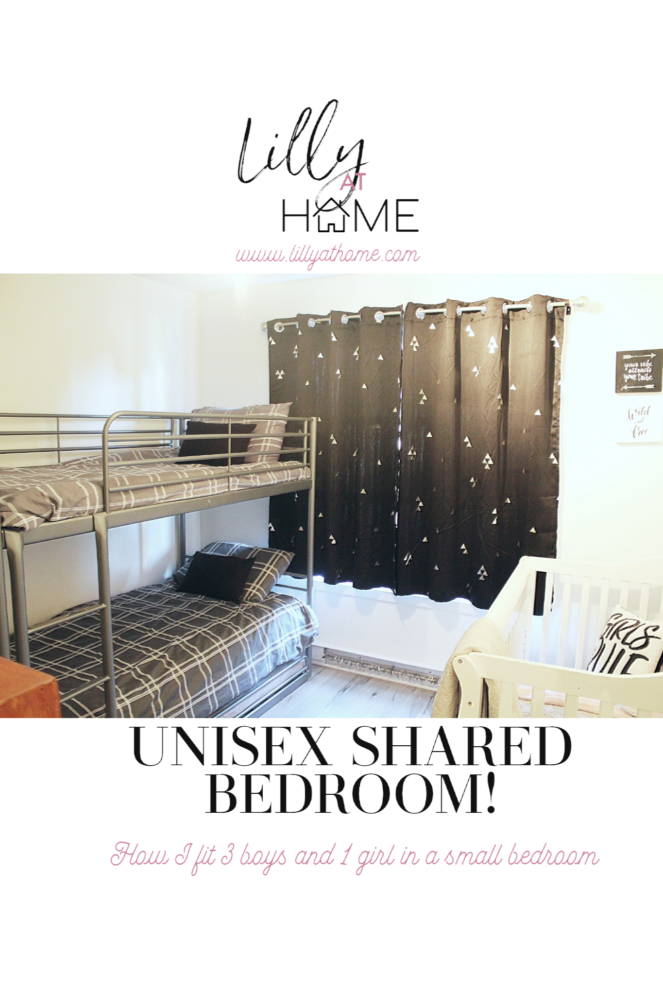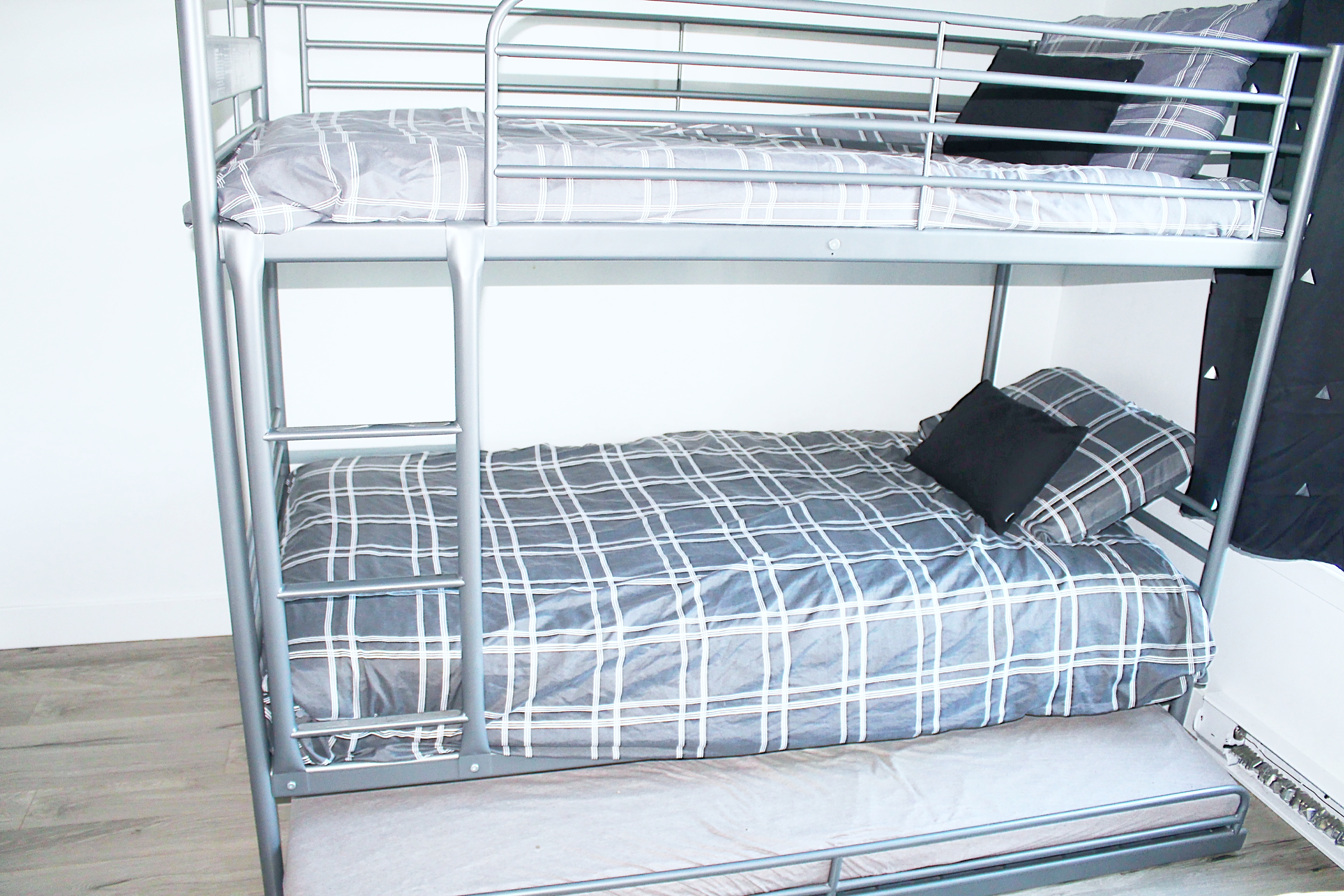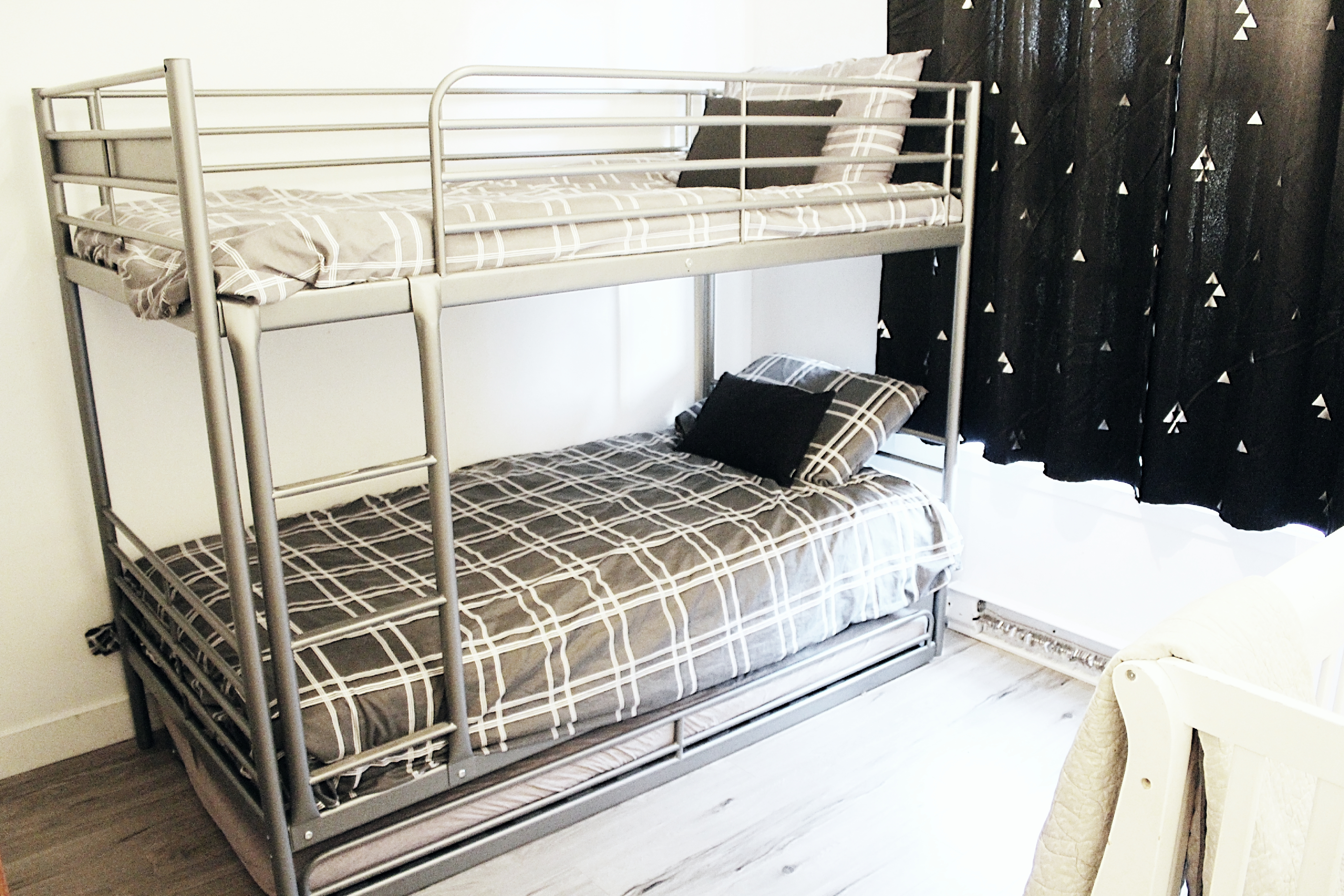 This room works well for our kids and they are happy to be close to one another. As you can see, I chose to go with a black, white and grey color scheme to keep things unisex and ensure the boys wouldn’t overpower the girl In the room and vice versa. I really wanted the kids to all feel like the space is theirs! I would have loved to put a cute rug down but with the height of the trundle bed being essentially down on the floor, I am sure a rug would get in the way of it rolling out easily. I think I may add some more wall art and possibly more storage solutions in the room but for now the room works! I will keep you updated on any changes and will eventually share their closet as well and how I’ve made it work for the kids. I’ve made sure to do everything on a budget as always, and I’m glad that I was able to execute my vision without breaking the bank!