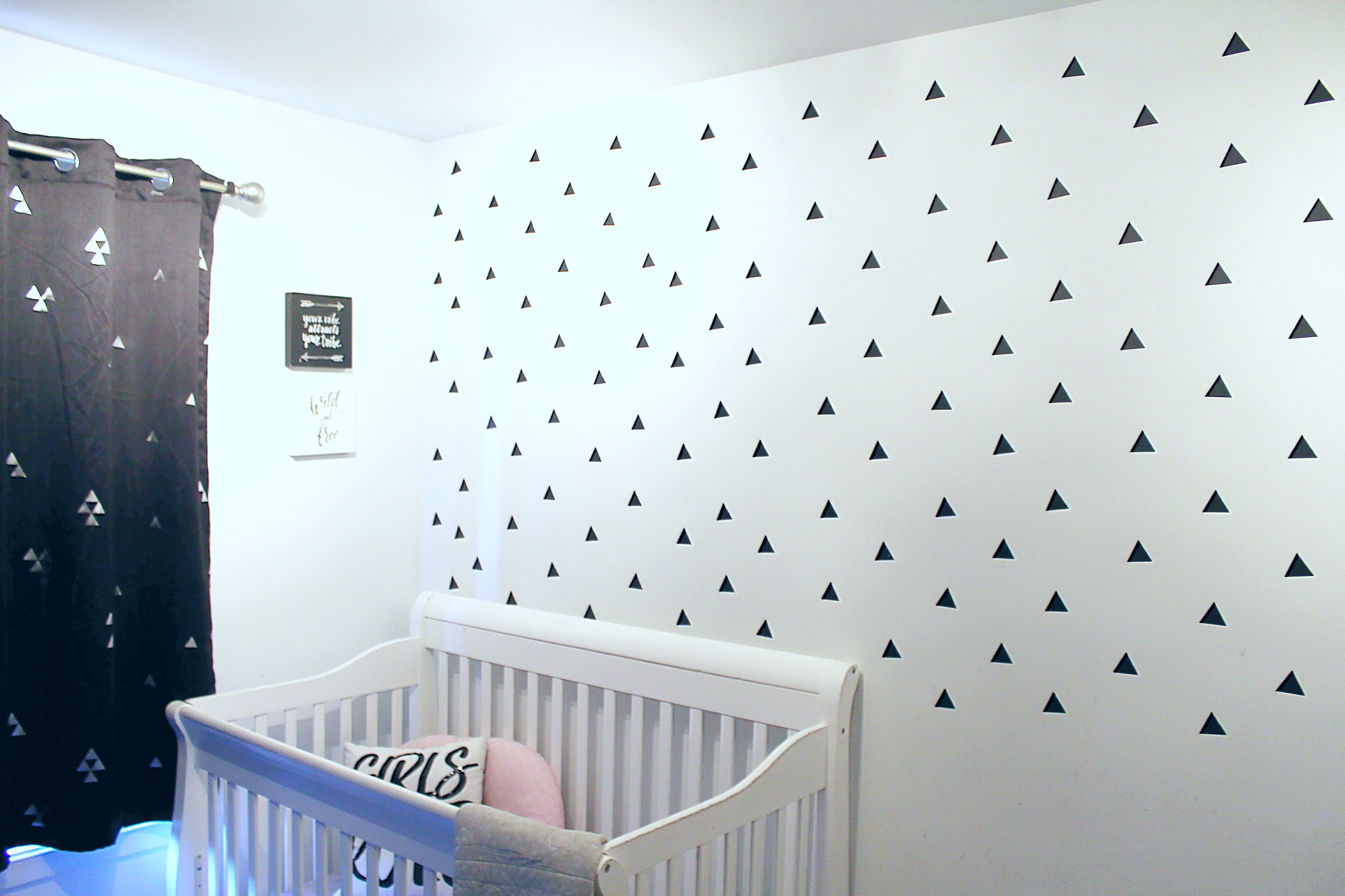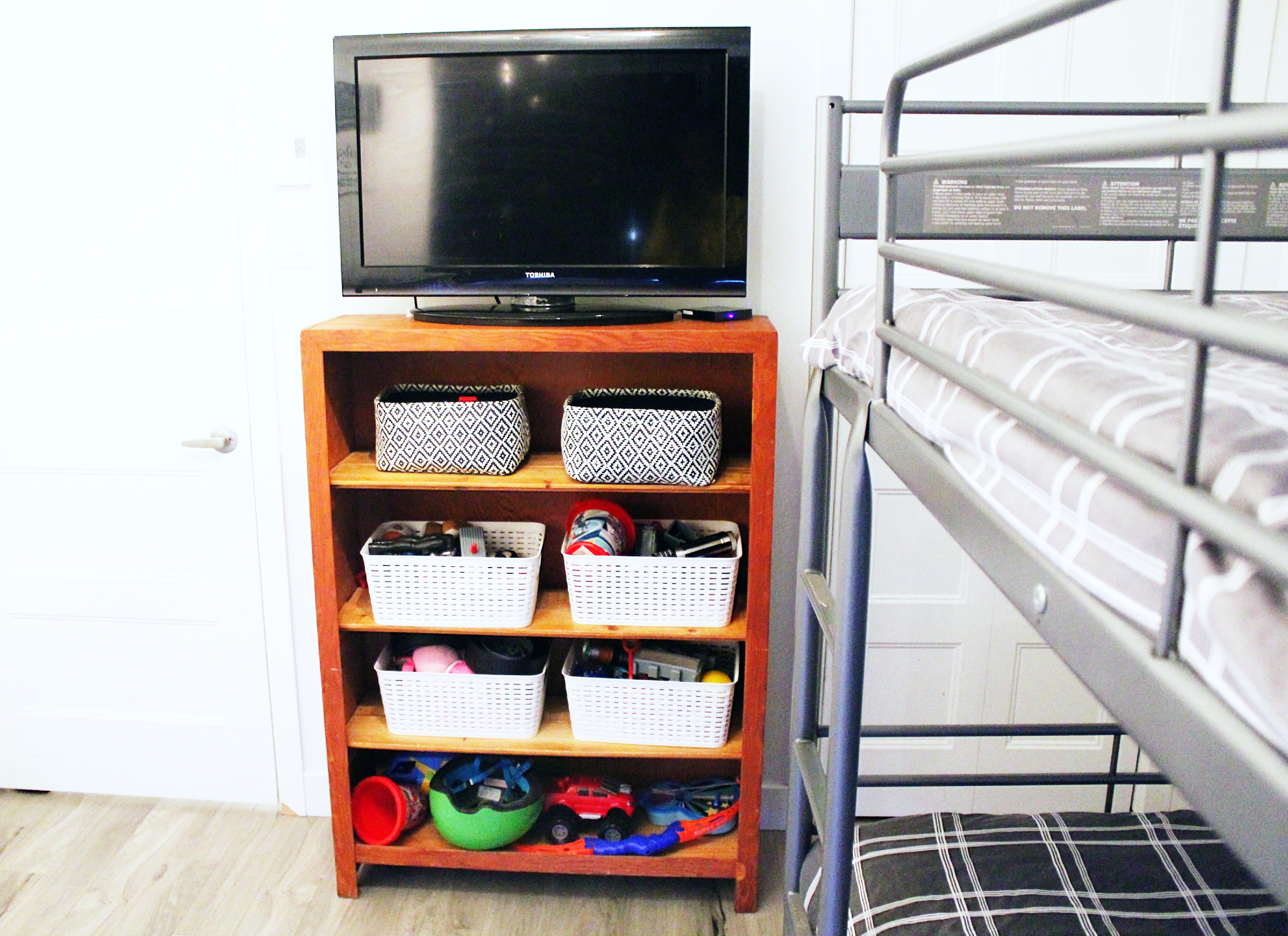 Wall art purchased at a local liquidation store for 3 bucks each. The blackout curtains were recently purchased for $20 on Amazon (free shipping with prime!) I ordered 63″ length because the previous curtains were a standard 84 inch length and with the wild playing, the boys somehow got the curtain caught in the trundle bed and it ended up yanking off the front cover of the baseboard heater 🤦🏾♀️. So for their safety and our budget sake, shorter curtains are the way to go! (Heater will definitely be repaired soon) Other than the length, I love the matching geometrical patterns in silver which tie everything together so well!SVARTA Bunk bed with trundle from IKEA (I don’t believe they sell this at IKEA anymore but I got the bunk bed and trundle for about $300 which saved us hundreds of dollars had we opted for a standard triple bunk bed)Cute throw cushion from Bouclair, purchased in the liquidation section for $7 or $8 Overnight, there is just enough room for the trundle bed which pulls out easily (duvet cover sets from Jysk for $9 each for the 3 boys. Fitted sheets also from Jysk for $3). Black cushions from Bouclair in liquidation for $11 if i remember correctly. I only purchased 2 as the trundle is pushed in every dayThis bookshelf used to be in our bedroom but it is the perfect fit for the kids toys and TV! I’m contemplating painting it black, grey or white. The white baskets were purchased from Dollarama for $4 each. I will purchase a larger bin for the bottom shelf once I find one in the right dimensions. The larger toys Stored in the closet!These gorgeous monochromatic baskets were essentially free from Bouclair when I purchased the cushions (buy 2 items, get the third free… something like that)These black triangle wall decals were free using the Wish App and I paid maybe 4 or 5 bucks in shipping😉Baby girl’s crib still has a touch of pink! Her crib was purchased at a warehouse sale put on by Bo Bébé which is an awesome baby store in Quebec. I believe we got this crib for $110, which was a steal! At the time, we already had Jonathan’s crib which was about $650 but he was still using it and we intended on converting it into a toddler bed once he was old enough. So we knew we wanted to get a second crib and I definitely didn’t want to drop another $650 in such a short period of time, so this price was perfect for us. But as we had to suddenly move before our lease was up at our previous place and decided on this place, Jonathan’s crib quickly got put to the side as we knew we couldn’t fit both his and Destiny’s crib in that bedroom. Had we known that our living situation would change so quickly, we could have avoided buying a second crib as one is currently in our storage. But if, and when we move to a bigger place, we might make use of Jonathan’s crib and convert it to the toddler or double bed in an additional bedroom. So I still count it as a win!